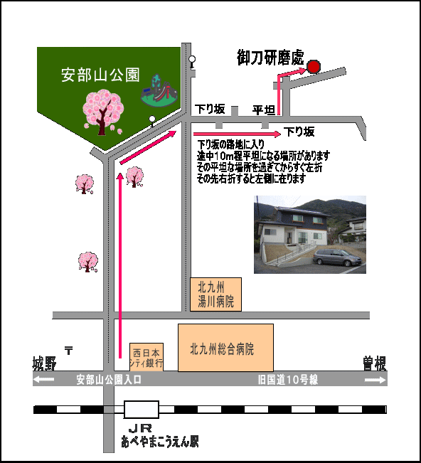 JRあべやまこうえん駅より、車で3分です。お車でお越しの際は、安部山入口交差点から公園方向へ500m進むと公園に突き当たります。公園の右側から長い下り坂を300mほど下り、左折して、すぐに右折すると左手にございます。駐車場も完備 御用の際は、電話かメールにてご連絡下さい。